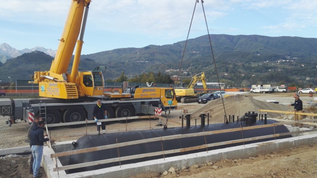 Deposito prodotti petroliferi.Provincia di Lucca. Progetto e direzione lavori per la realizzazione di impianto di canalizzazione acque di pioggia, con installazione vasca di trattamento acque meteoriche contaminate, vasca di invarianza idraulica, rifacimento manto stradale con asfaltatura dell’intero piazzale.